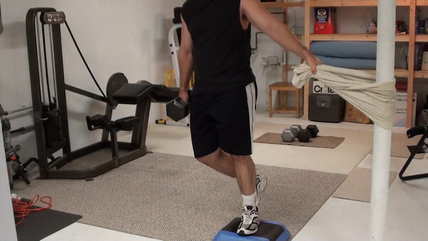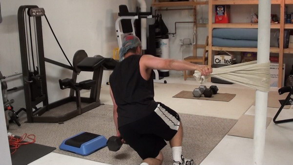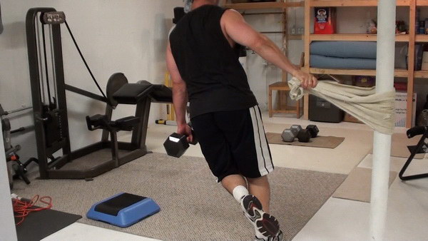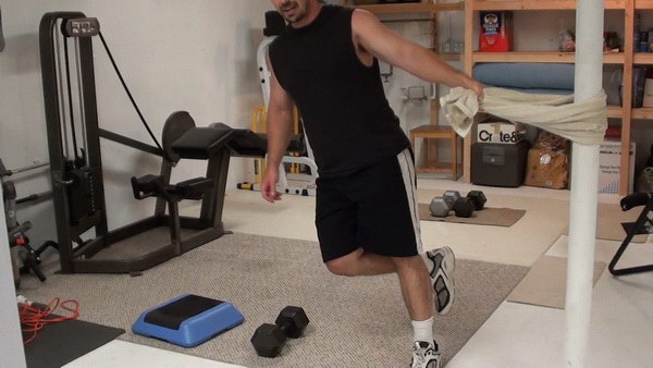 Technically, the version of the exercise I'm going to show you with the towel wrapped around a solid post is a step-back lunge because you'll touch your back leg to the ground.