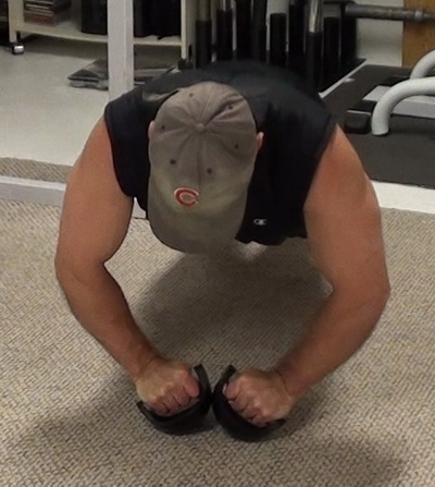 Set your hands on the handles, round side down, then perform a normal push-up.