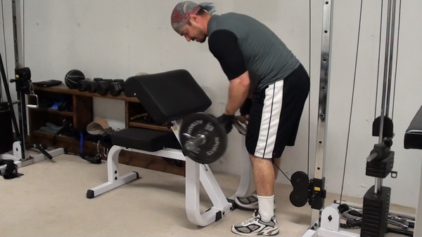Set the Preacher bench in front of the low pulley (a few feet back from it). Start with the empty bar on the floor. The setup I prefer to use is an ankle strap around the bar then clipped to the low pulley. It makes it VERY easy to set up and perform Hybrid exercises.