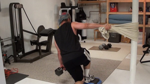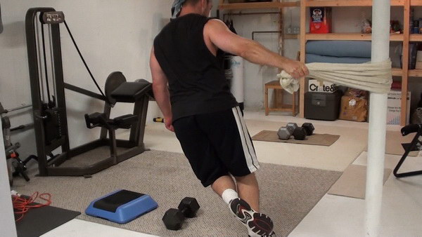Technically, the version of the exercise I'm going to show you with the towel wrapped around a solid post is a step-back lunge because you'll touch your back leg to the ground.