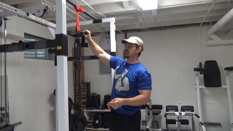 You can very easily adjust tension using the small red button on the edge of the plastic piece (you can see it by my left shoulder in the picture below). Just hold down the button and pull or push that thing up or down to shorten or lengthen the bands. This makes adjusting resistance VERY easy and fast (it's the best system I've seen for doing it, to be honest...standing closer or further to adjust how much a band is stretched can only do so much in terms of adjusting resistance).