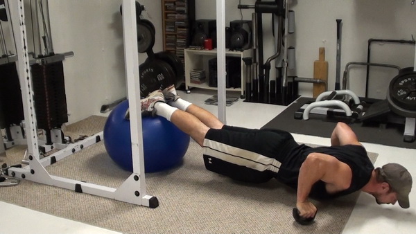 This exercise adds even MORE instability to the push-up by setting your feet on top of a constantly-shifting ball. This places great demands on the core while you're doing the exercise.