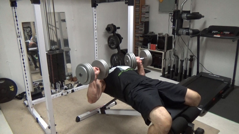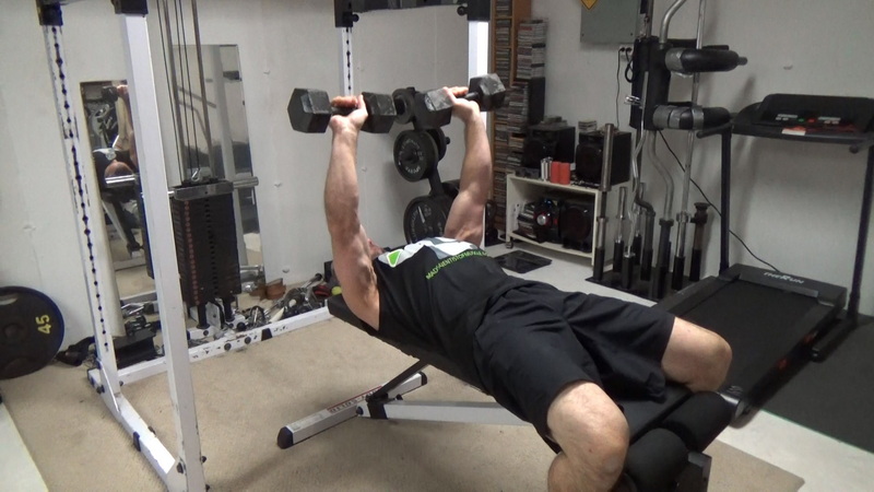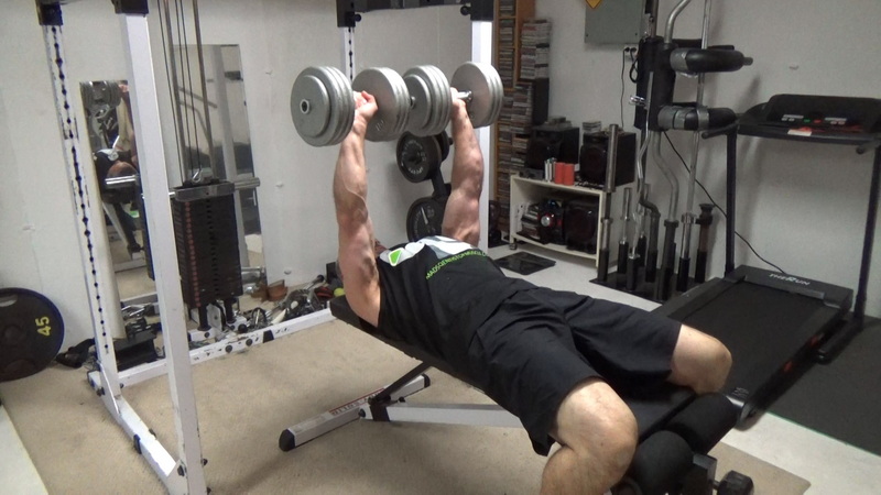 This training protocol results in 4 to 6 minutes (or more) of near-continuous work and blood flow. It will literally FLOOD your pecs with blood, pushing in nutrients and oxygen, setting the stage for extreme growth and vascularity. We're going to be alternating between two exercises using two VERY different loads. This is going to allow you to work continuously for relatively long periods by targeting completely different muscle fibers types, motor units and energy systems. It's essentially a "giant set" of two repeating exercises, alternating light and heavy, for 4-6 rounds through, done without rest. You will use ONE exercise with two sets of weights...one light weight that you'll do for very high reps (I'm using 25 lb dumbbells) and one heavy weight that you'll do for low reps (I'm using 75 lb dumbbells). This weight should be about 2-3 times as heavy...we'll be doing 2 rep sets with it.